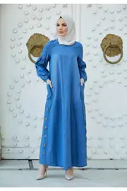 Kadın Açık Mavi Yandan Düğmeli Balon Kollu Tesettür Kot Elbise – FDL1001